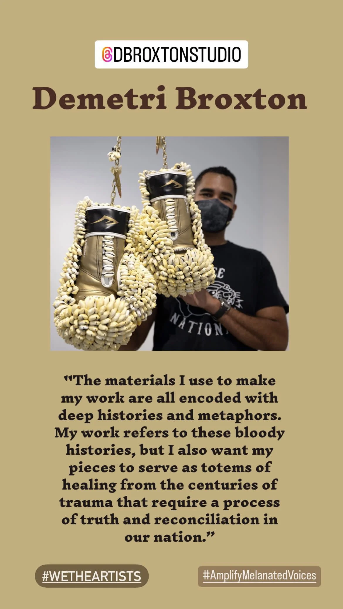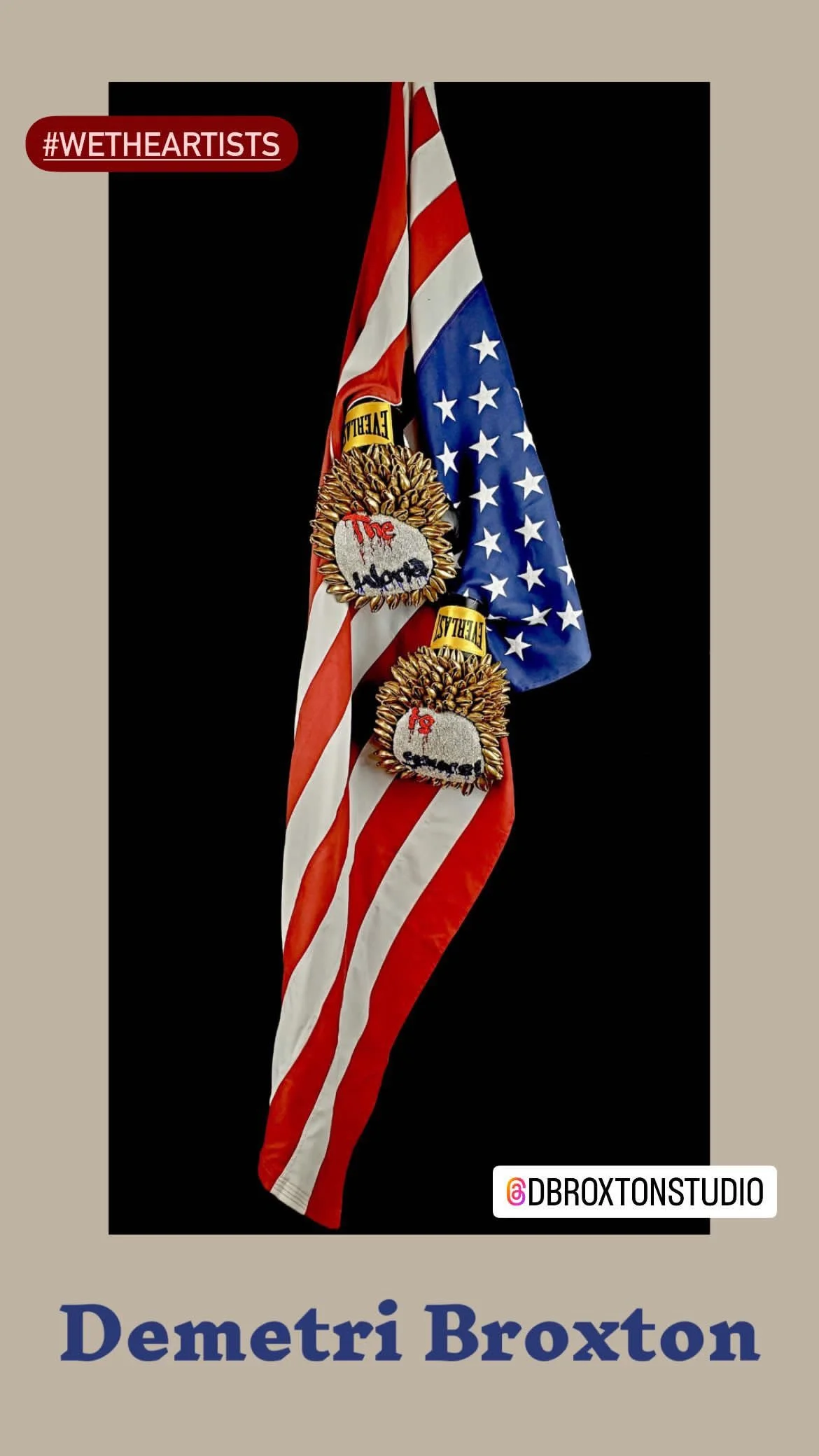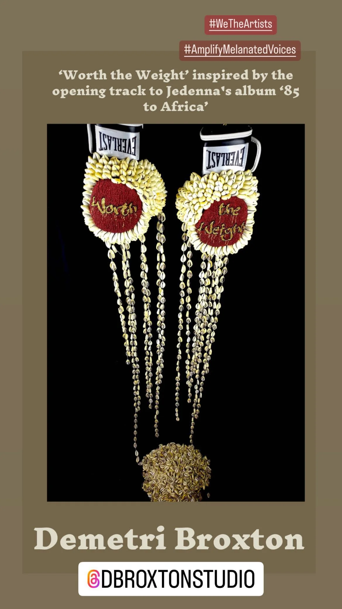 Demetri is known for sculptures made of glass beads and cowrie shells covering boxing gloves, flags, and boxing robes. The work encapsulates contemporary hip-hop with the slave trade and the monetary cost of human lives. Cowrie shells and glass beads, now associated with African pride and ancestry, played a role as a store of blood money during the Transatlantic Slave Trade.