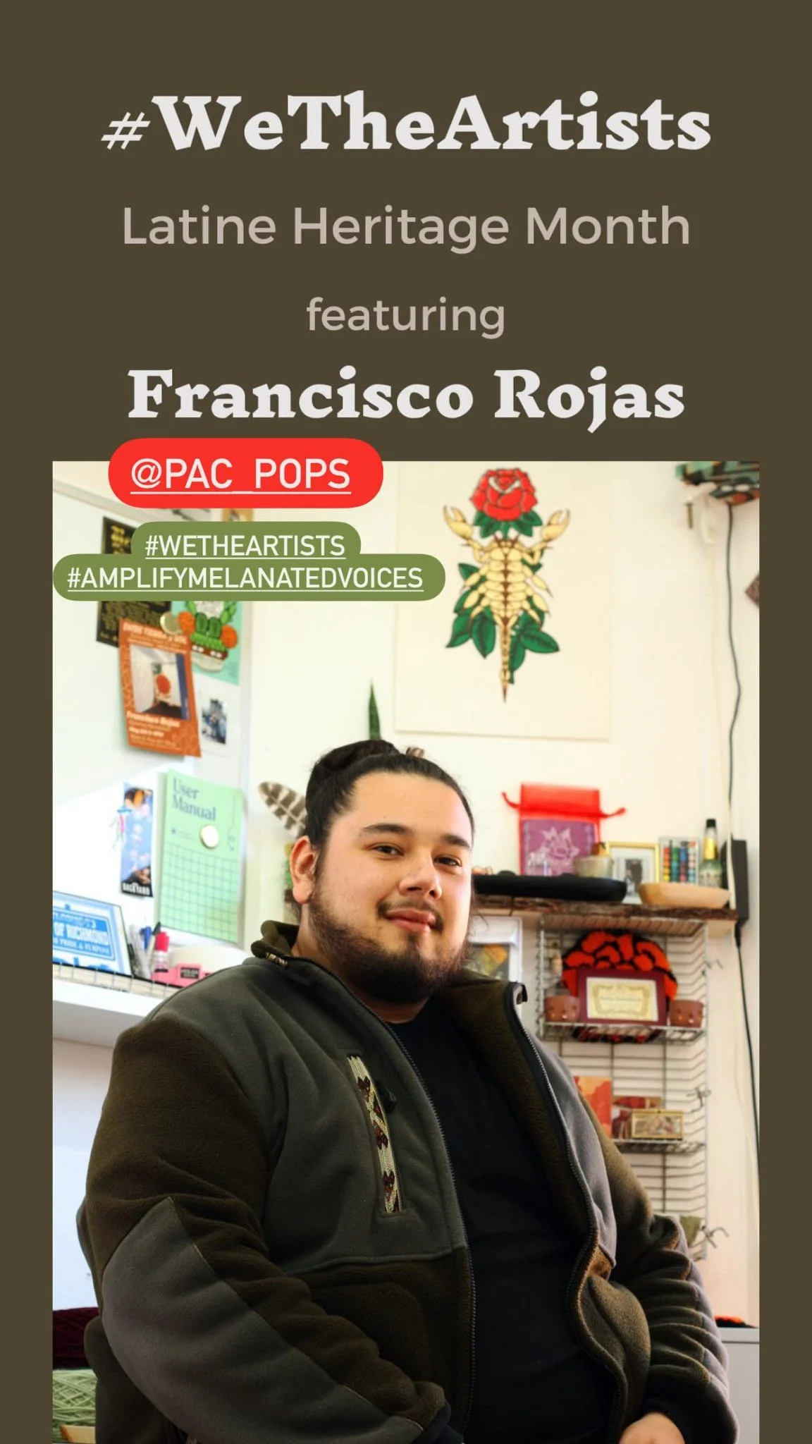 Meet Francisco Rojas (He/Him), is a Mission District-born artist now living in Richmond, CA. He still considers the Mission his home and gladly takes any opportunity to come into the city to be with friends, family, or go grocery shopping.