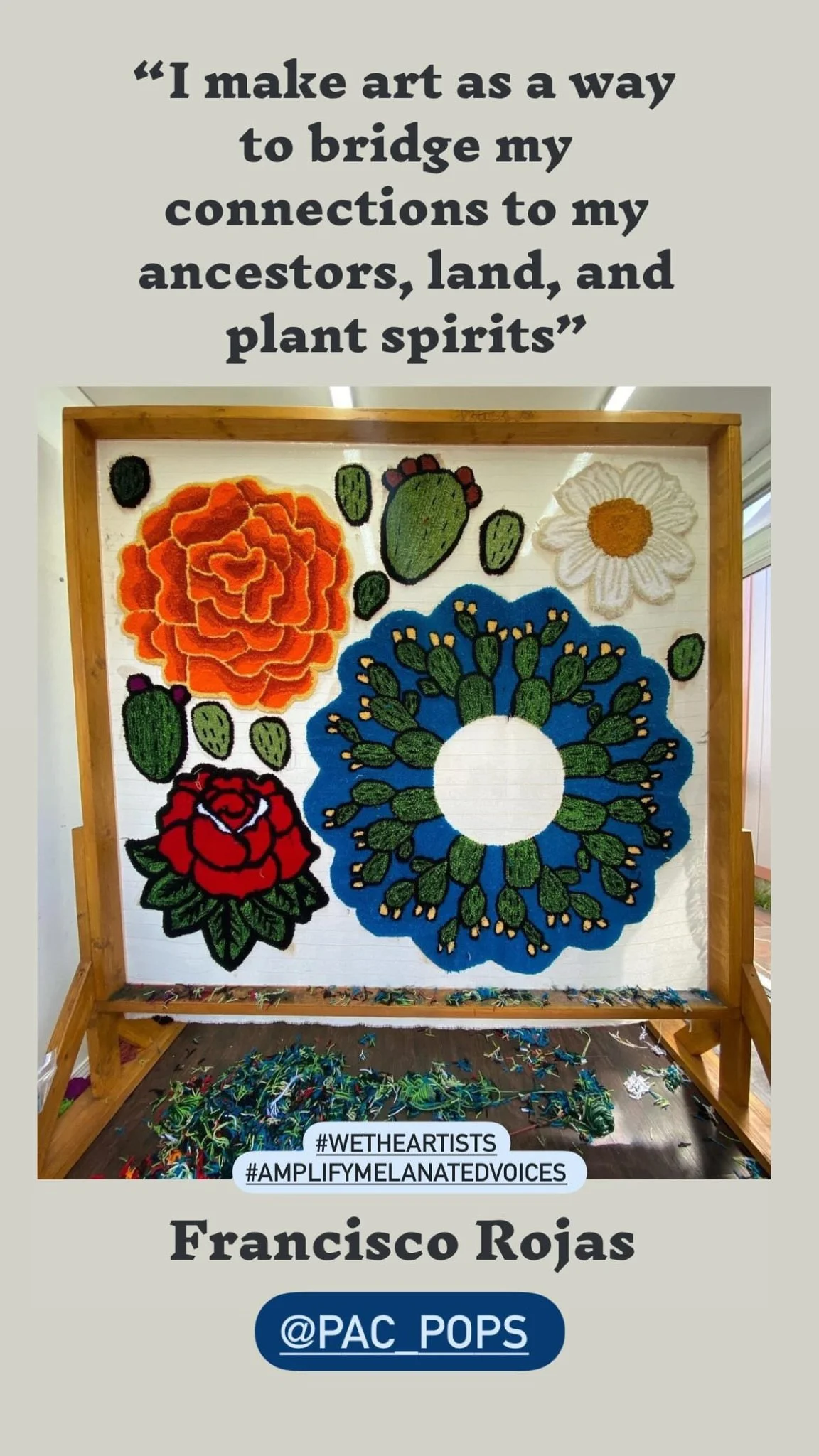 Francisco is a multi-disciplinary artist with expertise in printmaking, bookbinding, textiles, and rug tufting. He utilizes his art practice as a way to bridge connections between his ancestors, land, and plant spirits. He shares, “Location is important to me as it’s a place where our ancestors call home, elevating the vibration of the land.” His practice relies on honoring and remembering rituals, botanical connection, and ancestral knowledge. He sees his process as a ritual, finding that there are moments when all his practices intertwine together and others when they rely on their own individual moments.