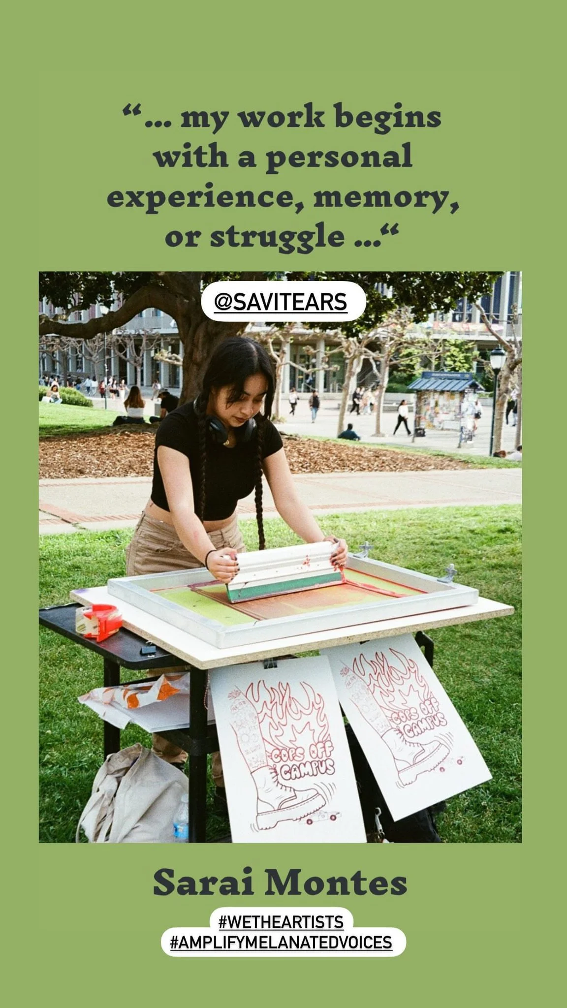 Meet Sarai Montes (she/her), an Indigenous Oaxacan (Ñuu Savi) and Salvadoran multidisciplinary artist born and raised in the Bay Area. She notes growing up here has shaped her relationship with political and public art. She notes her profound appreciation for political art has played in historical and contemporary social movements. Her upbringing here in the Bay Area has shown her that art can be a way towards solidarity with other communities and be used as a tool to hold space and talk about difficult yet important topics with people of all ages and backgrounds.